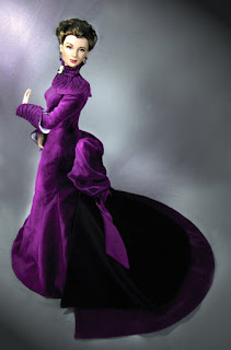 It had been a wish (and a dream) that Franklin Mint would release this dress. At that time, no other doll could have carried it well than the Franklin Mint Scarlett. But when Tonner released in Fall of 2008 its "In the Mist" costume, collectors were awed by its elegance, smitten by its color (faithful deep purple found in the sketches of Walter Plunkett). The bustle is attached at its bottom and opens at the back for the doll to be dressed. My only gripe was the collar was closed and not open as the one we see on film. The Cameo on the collar has an amazing detail of the profile of a woman - it is not faithful to the cameo we see on film. The skirt is tight, almost forming a serpentina form. The bustle at the back is poufy and is reminiscent of the change of era from the big ballroom skirts to slimmer forms of the late Victorian era.