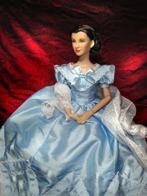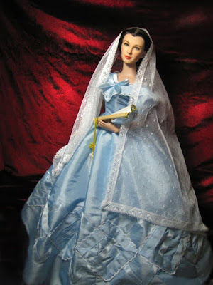 In previous posts about Tonner's "Travelling with Mother to Savannah", I posted pictures of the ensemble. Here now is the doll wearing Tonner Melanie's dress to Scarlett's Wedding. I think the "immaculate" pale blue is an excellent complement to the doll's supposedly fair complexion. What I find unique about the "Travelling with Mother to Savannah" doll is its hairstyle -- it has a very defined middle part that goes all the way to the back. Something you don't find in the regular Tonner Basic Scarlett. The hairstyle is very much Civil War inspired with two braids crowning the head and intertwined at the back. The hair is very tight and I had to loosen it a bit to bring it down as much as possible. The effect is a hairstyle that can wear the Franklin Mint Wedding Gown (which unfortunately because of its rarity) I do not have. I am thinking Tonner will re-create this sometime soon as it still has a strong "want' in the marketplace. And I foresee, it may be priced at a premium price than the rest of the line (hope not, we've had too much of overpriced dolls which sell for less than half at year's end).