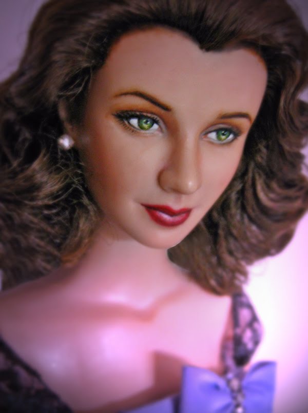 I love the color and style of her hair. I have been snipping off the stray hairs with little scissors though to clean up her hair-do. Her face is gorgeous. Her lips are a dark red and eye make-up matches her dress.